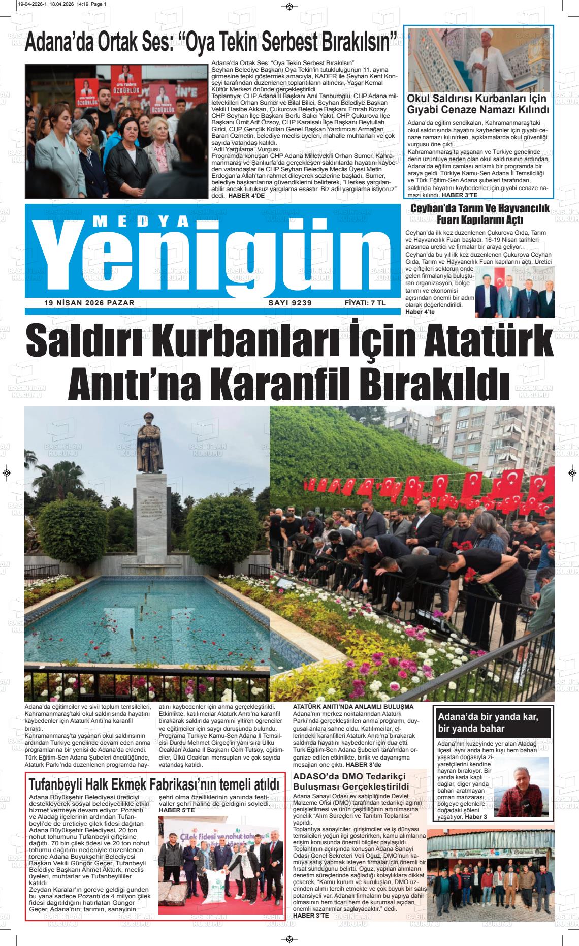 Adana Yerel Gazeteleri 19 Nisan 2026, Pazar Günü Manşeti