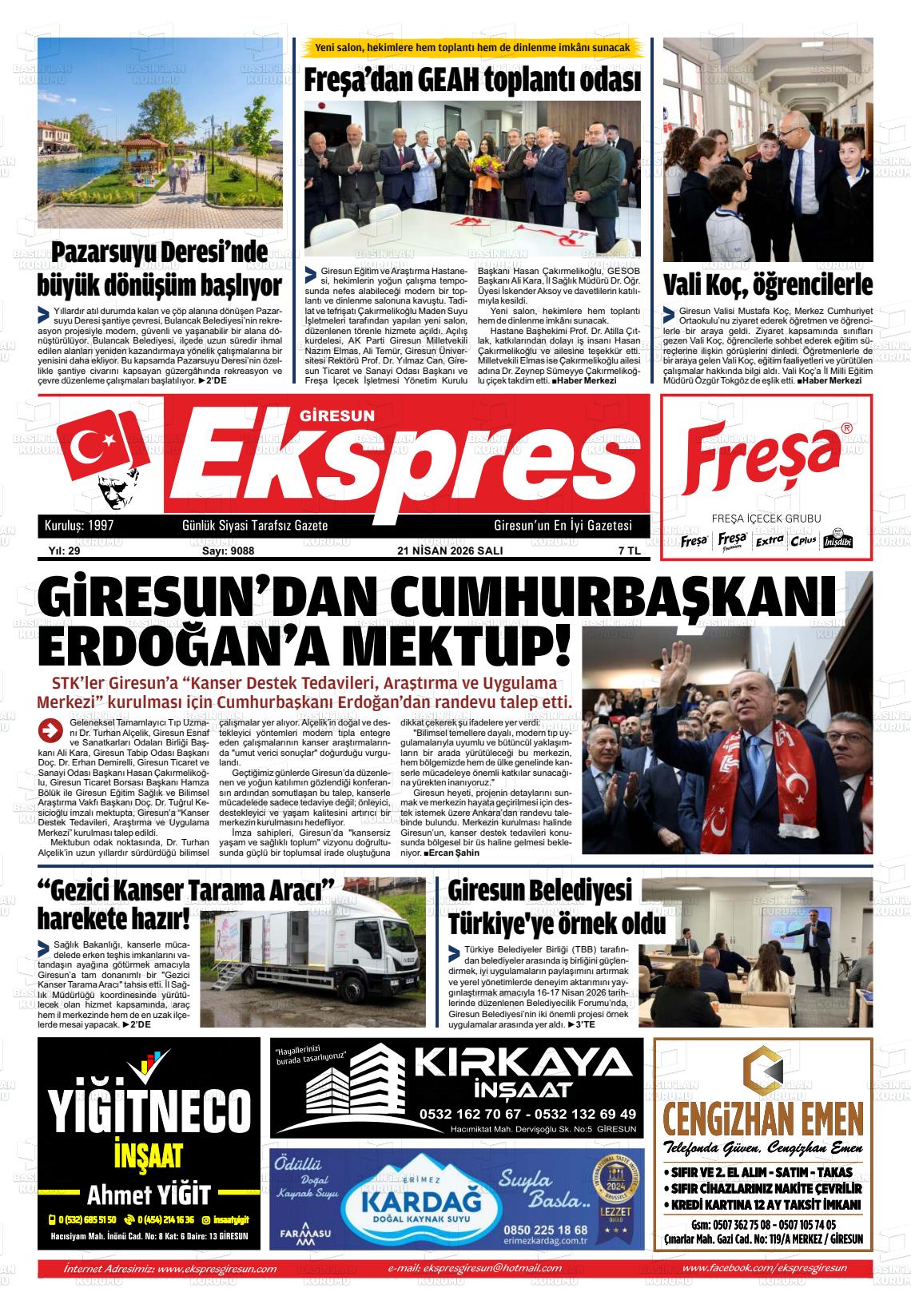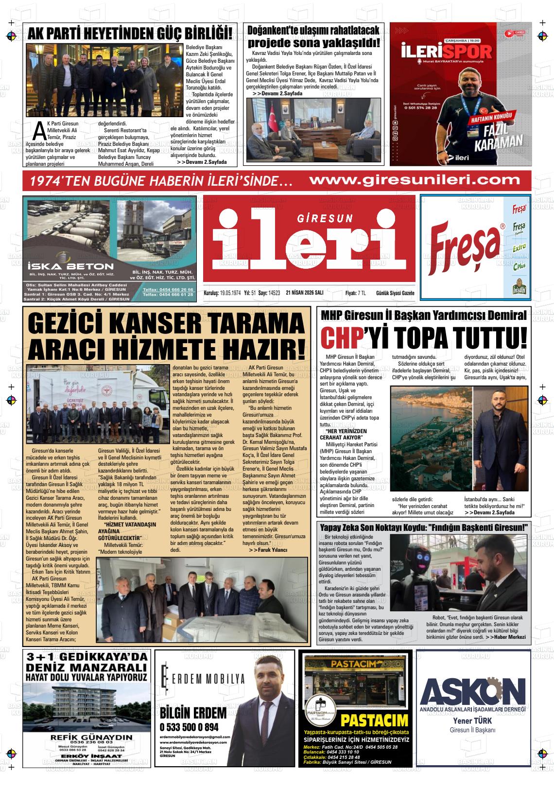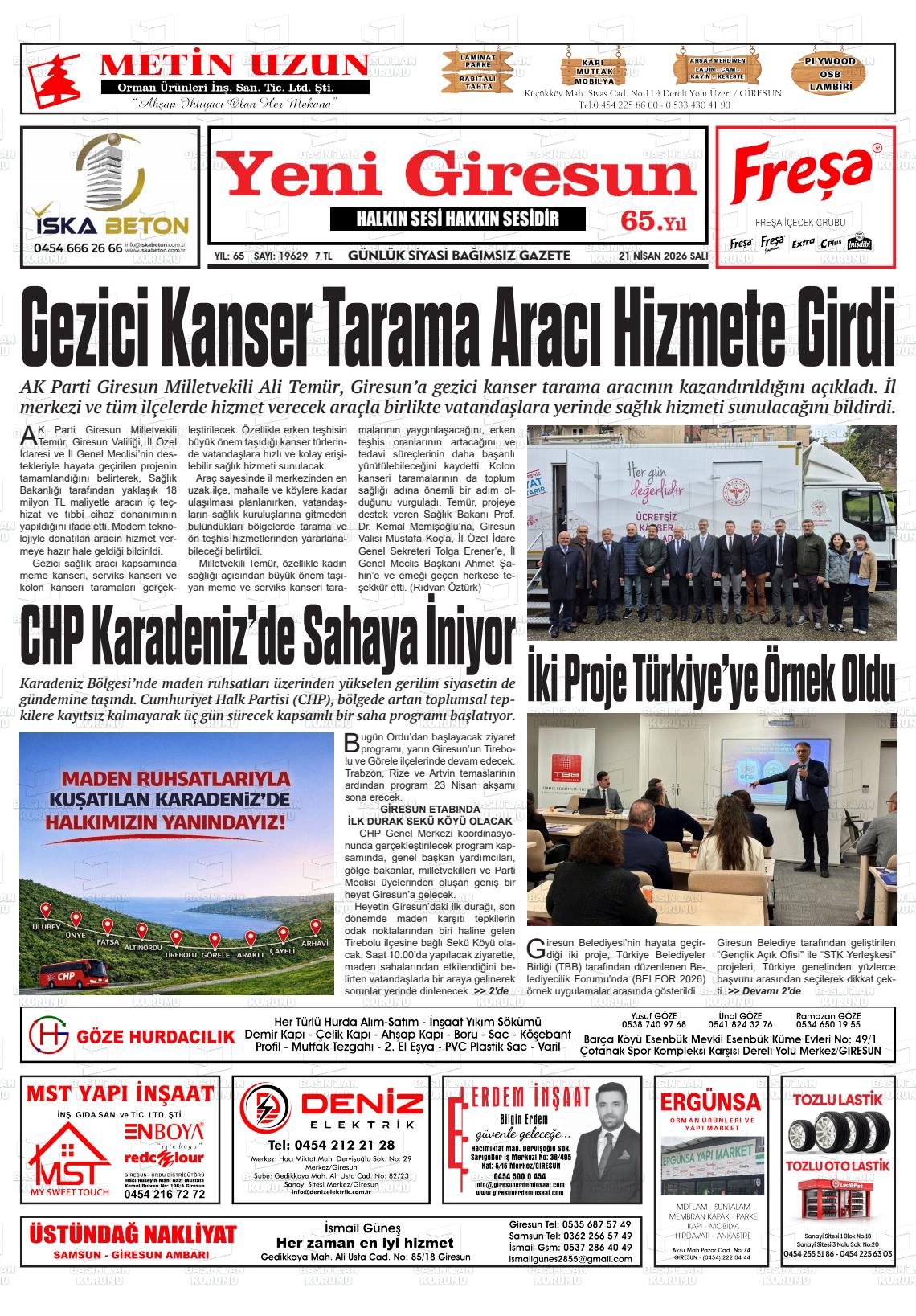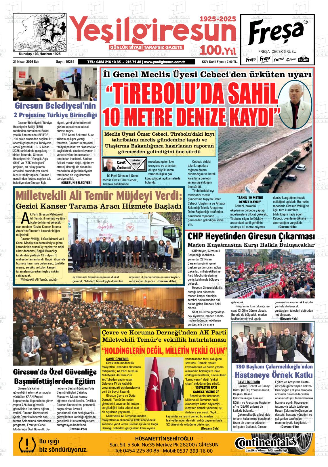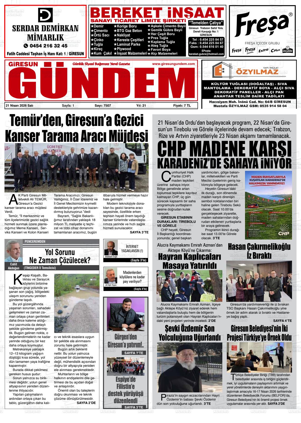 Gİresun Yerel Gazeteleri 21 Nisan 2026, Salı Günü Manşeti