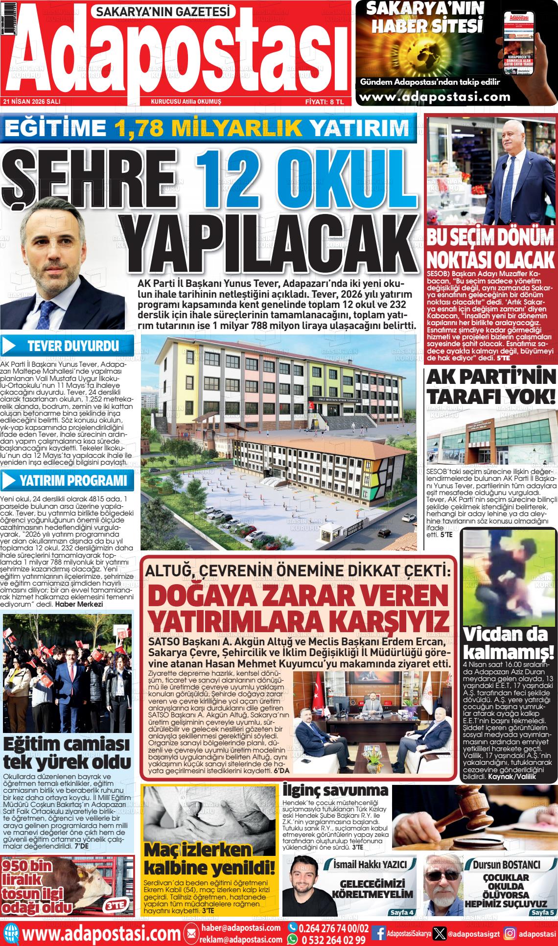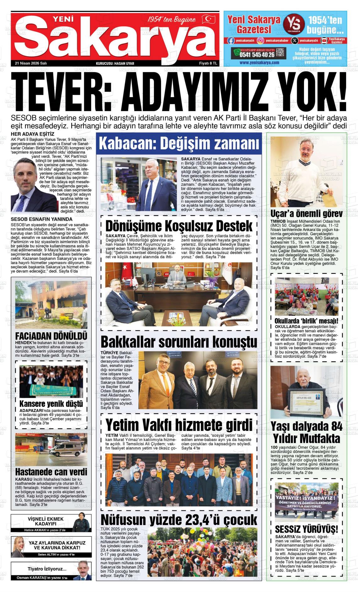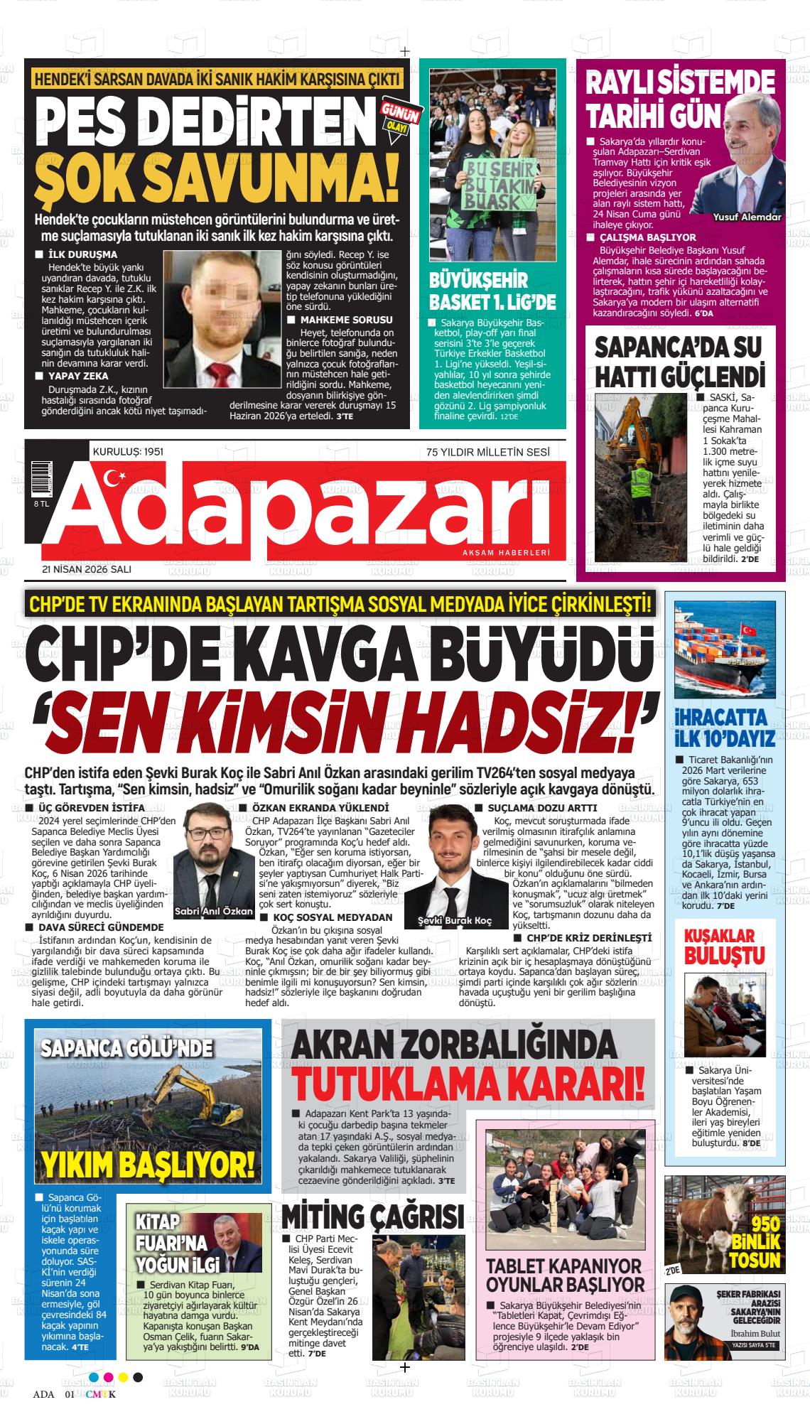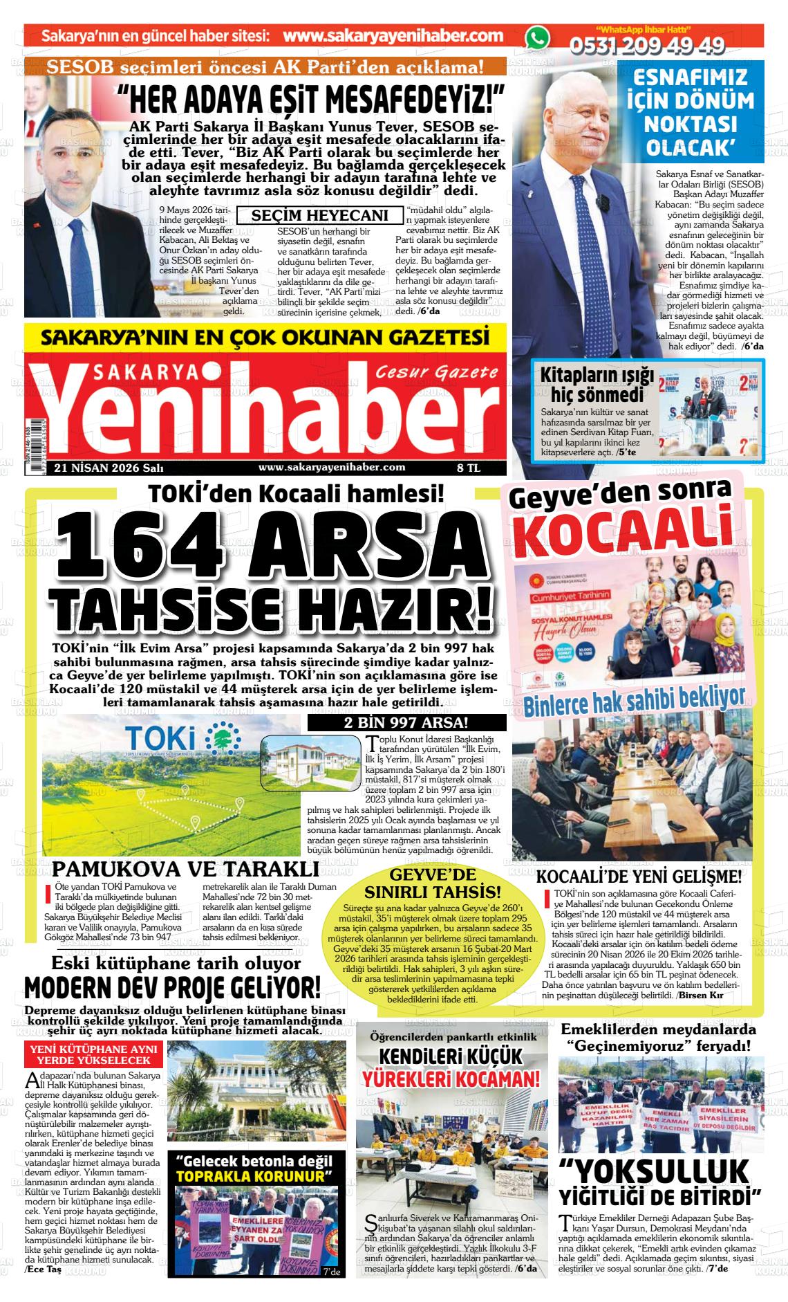 Sakarya Yerel Gazeteleri 21 Nisan 2026, Salı Günü Manşeti
